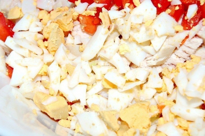 2. Вареную курицу нарезать мелкими кусочками.