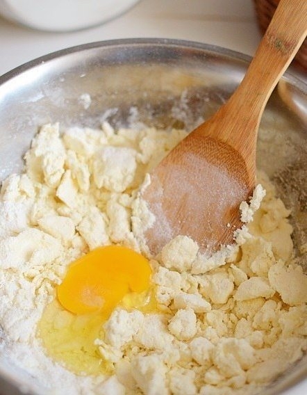 1. Мягкое масло растираю с половиной муки, добавляю соль и сахар, разрыхлитель и просто растираю лопаткой.Добавляю яйцо и, постепенно подсыпая муку, вымешиваю тесто. Тесто готово, если оно свободно отстаёт от рук. Обычно уходит от 2,5 до 3 стаканов муки в общей сложности. Тесто делю на две половины, помещаю в полиэтиленовые пакеты и даю отлежаться в холодильнике не менее часа.