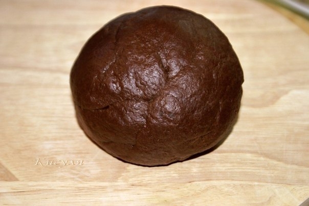 Воду нагреть, растопить в ней масло, немного остудить, добавить яйцо, слегка взбитое с солью. Влить полученную смесь в муку, смешанную с какао, и месить тесто, пока оно не станет гладким и не начнёт отставать от рук. Готовое тесто накрыть пакетом и дать ему отдохнуть 30 мин.