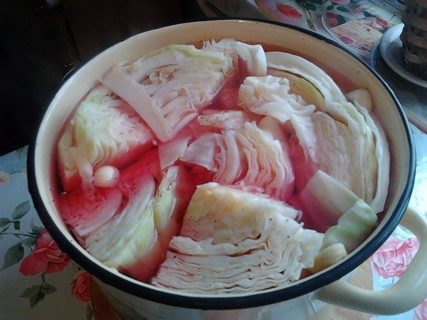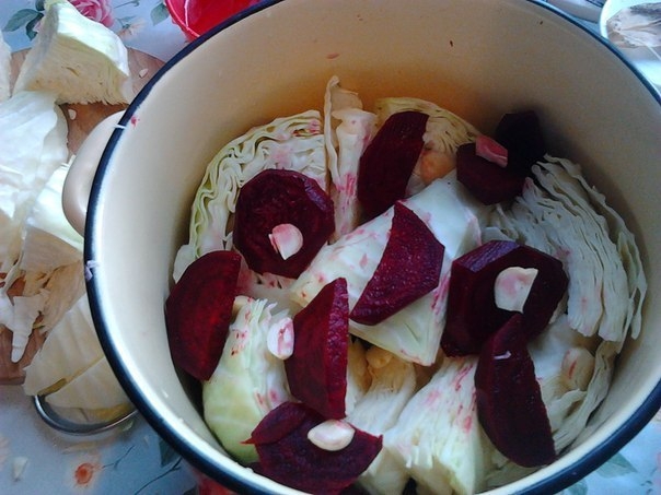 2. В глубокую кастрюлю складываем слоями:куски капусты, затем кружки свеклы, затем дольки чеснока, и кусочки гор. перца, перец чёр. горошком, и так кладём слой за слоем чтобы до краёв кастрюли куда мы всё это уложим оставалось ещё свободного места вверх около 5 см.