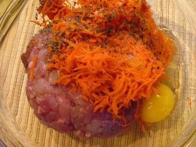 Фарш индейки смешать с натертой морковью, яйцом, солью. специями: