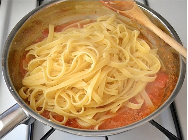 Когда соус немного загустеет, добавьте пасту (предварительно промыв ее под проточной водой).