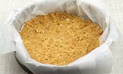 В качестве коржика мы будем использовать измельченное печенье в крошку с добавлениям к нему масла. Печенье мы используем песочное, поэтому особых усилий для того чтобы его измельчить нам не понадобится. В крошку добавим масло, советую предварительно растопить, чтобы упростить задачу вымешивания, растапливать масло можно отдельно от печенья либо вместе с ним в паровой бане.