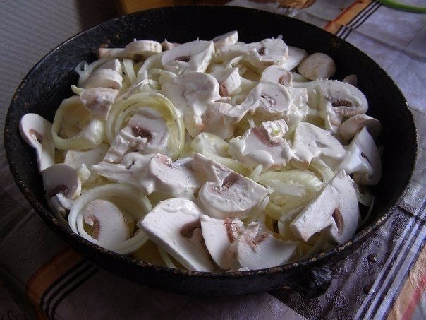 Нарезаем картофель, лук, грибы, помидор. Выкладываем слоями на сковороду, поливаем соусом и посыпаем сыром, выпекаем при температуре 180 гр. 40 мин.