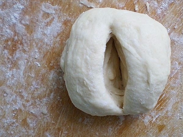 9. Делаем небольшой разрез посередине. Выворачиваем булочку. Если вы любите сладкие булочки, то можно посыпать сверху сахаром.