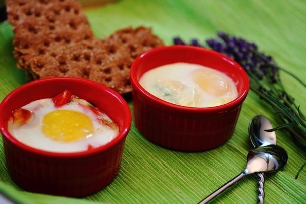 2) Для яиц-кокот в итальянском стиле: на дне 2 форм распределить кубики сыра, листья базилика и помидоры. Вбить по одному яйцу.