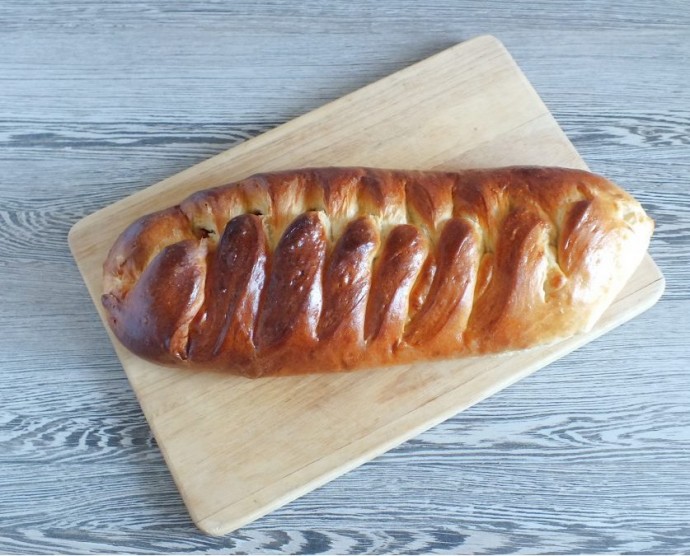 6. Посередине пласта распределите варенье, не доходя до краёв. Свободные края теста под углом нарежьте на полосы. Заплетите в "косу", соединяя противоположные полосы между собой. Концы пирога хорошо закрепите.