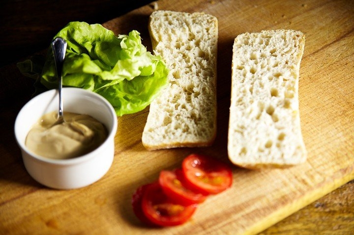 4. Обе половинки смазать соусом. Для соуса смешать до однородности майонез, дижонскую горчицу, соевый соус.