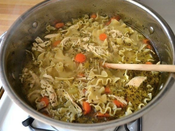 Через час достаньте курицу из кастрюли и, помогая себе 2 вилками, разделите грудки на волокна. Посолите бульон. Выложите лапшу в бульон и отварите в течение 7 минут при максимальной температуре. Верните курицу в кастрюлю, влейте дополнительных 2 стакана воды (за счет того, что лапша впитала много жидкости). Попробуйте бульон и при необходимости добавьте еще соли.