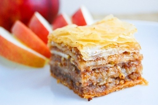 - Третий раз выложите все, кроме яблок: орехи - 3-4 слоя теста. Сверху смажьте щедро сливочным маслом и острым ножом нарежьте пахлаву.