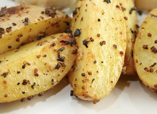 Подготовьте противень для картофеля, застелив его фольгой и смазав маслом. Духовку нагрейте до 220 градусов. Все ингредиенты для маринада смешайте и взбейте венчиком до однородной массы. В эту же миску выложите нарезанный картофель. Поперчите и посолите дополнительно. Перемешайте и выложите картофель одним слоем на противень. Выпекайте 20 минут. Затем переверните противень другой стороной и выпекайте еще 25 минут до золотисто-коричневой корочки. Подавайте картофель теплым.